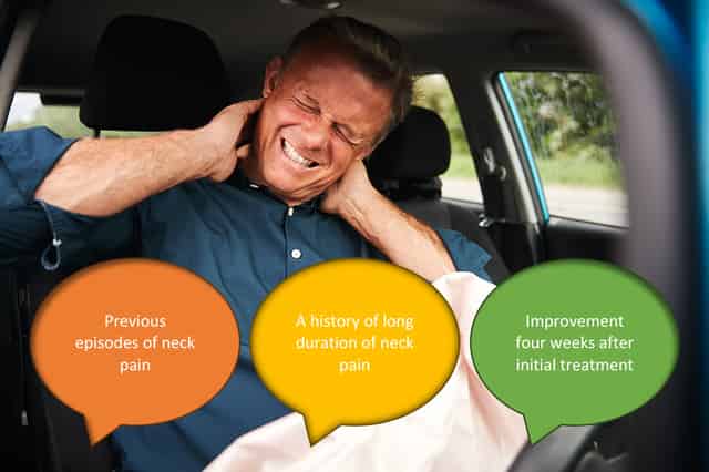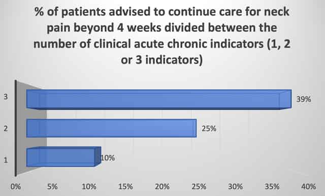 The study revealed that a long duration of neck pain was the strongest clinical indicator for recommending continued care after four weeks. It also showed that the number of clinical indicators found in a patient influenced if the patient was advised to continue the treatment beyond four weeks.